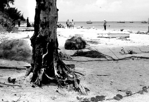 | →竹蔗竂海滩上一棵因海浪淘涮根部枯死的木麻黄。 新华社记者 梁思奇 摄 |