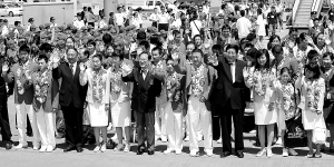 8月29日,国家奥运金牌运动员代表团与嘉宾合影。当日,在北京奥运会上获得佳绩的国家奥运金牌运动员代表团抵达香港,展开三天访港行程,与香港市民交流并进行公开示范表演。 新华社记者 吕小炜 摄