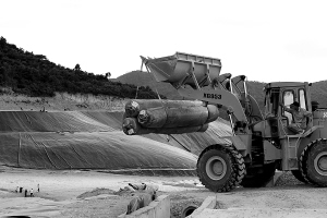 8月28日下午,位于三亚市凤凰镇的高峰生活垃圾填埋场建设工地上,工人在进行最后铺膜工作。据了解,高峰生活垃圾填埋场的建设已经完成了工程总量的98%。 本报记者 程范淦 摄影报道