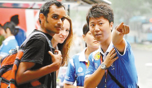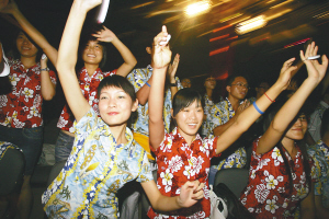 | 奥运期间,身着海南岛服的海南奥运志愿者与北京、澳门志愿者进行联欢活动。