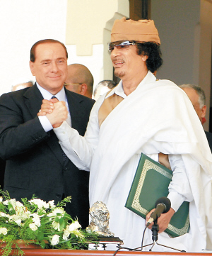 | 8月30日,在利比亚第二大城市班加西,利比亚领导人卡扎菲(右)和到访的意大利总理贝卢斯科尼在签订了友好条约后握手祝贺。新华社/路透 |