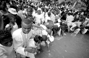 ↑8月29日,在尼日利亚西南部奥孙州首府奥索博的神树林举行的一年一度的奥孙节上,人们聚集在奥孙河畔祭拜河神。于2005年被列为世界遗产的奥孙-奥索博神树林举行的奥孙节是尼日利亚约鲁巴族的传统节日,每年都会吸引上万尼日利亚民众前来祈福。 新华社/路透