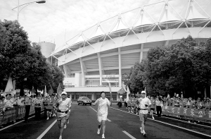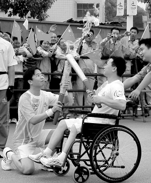 | 8月31日,北京残奥会圣火在武汉进行传递。图为火炬手魏轶力(中)手持火炬传递。