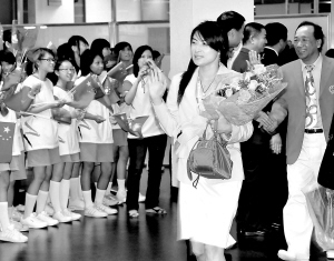← 8月31日晚,国家奥运金牌运动员代表团抵达中国澳门。图为奥运金牌运动员郭晶晶(前)走出澳门港澳码头。 新华社发
