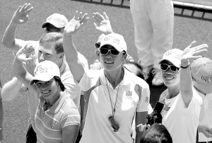 ↑ 8月31日,正在香港访问的北京奥运会内地金牌运动员代表团成员畅游香港海洋公园。图为国家奥运金牌运动员冼东妹(前左)、唐宾(前中)和金紫薇(右二)向游人挥手致意。 新华社发