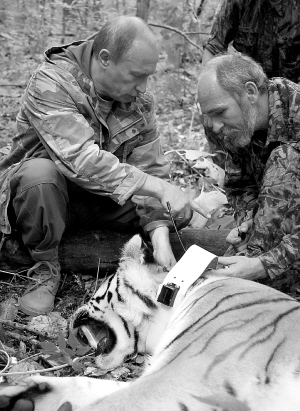 随后,他在俄罗斯科学家维亚切斯拉夫·拉扎诺夫协助下,亲手为虎戴上装备全球定位系统的项圈,以便科研人员监控它的动向和健康状况。