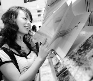 | 9月1日,第十五届北京国际图书博览会在天津国际展览中心开幕。来自51个参展国家和地区的1300家海内外出版单位,将在博览会期间进行展览展示、版权贸易和合作洽谈。本届北京国际图书博览会为期4天,其中前3天为专业场,后一天公共场将面向普通市民。图为一名读者在台湾泛亚出版社展厅被动漫画刊吸引。 新华社发 |