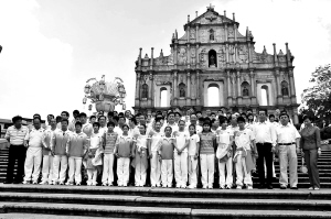 | 9月1日,北京奥运会内地金牌运动员代表团成员在澳门著名景点大三巴合影留念。世界遗产大三巴与奥运群星相映生辉。