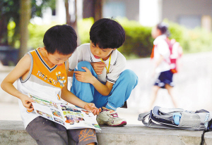 ←9月1日,全省中小学新学期开学的第一天,两名海师附小的学生在翻看刚发放的美术课本。
