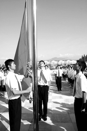9月1日,都江堰中学举行升旗仪式。当日,成都市都江堰中学新校区举行秋季开学典礼,这是四川地震灾区建成并投入使用的第一所永久性校舍。 新华社 记者 刘海摄