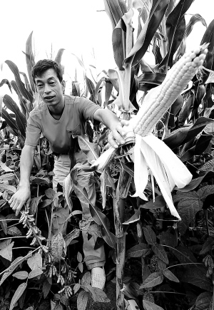 ←黑龙江省延寿县今年采用“立体栽培”技术种植大豆、玉米面积超过1万亩,这项技术的采用有望实现“一亩地打两亩地的粮”,比农民单一种植一种作物增收近1倍。延寿县玉河乡中胜村村民于子成展示“立体栽培”种植的玉米和大豆。 新华社发