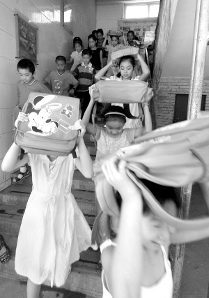 9月1日开学第一天,河北邢台新华南路小学进行防震演练,学生把书包顶在头顶向教室外面转移。