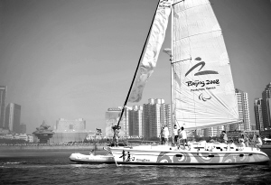 | 9月2日,北京残奥会圣火在青岛进行传递。图为火炬传递的帆船即将到达终点站———青岛五四广场。新华社发 |