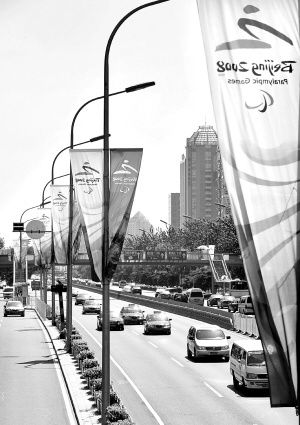 | 北京残奥会接待工作准备就绪.图为9月2日在东直门附近拍摄的北京残奥会彩旗。 新华社发 |