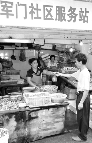 福州市鼓楼区军门社区黄梅钦(左)在自己的店里接待顾客(9月1日摄)。昔日下岗失业的黄梅钦在社区帮助下开起一家海鲜店,实现了再就业。 新华社记者 来建强 摄