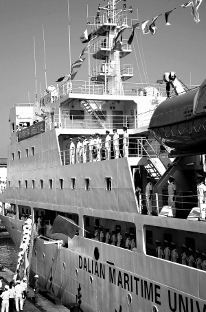 中国航海院校代表团 起程访问韩国 9月2日,中国航海院校代表团在大连港乘大连海事大学的教学实习船“育鲲”轮出访韩国。中国航海院校代表团由来自大连海事大学、上海海事大学等航海院校或航海专业的师生134人组成,他们将访问韩国木浦港和釜山港,与韩国的航海院校进行学术交流。 新华社发(徐德武 摄)