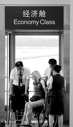 | 9月3日,一名参加残奥会的英国轮椅运动员在机场工作人员的帮助下离开通道。 新华社发 |