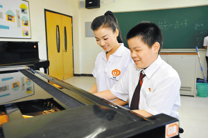 | 陈思思(左)与盲童来家俊合奏钢琴。 |