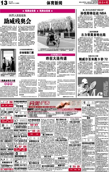 海南日报 体育新闻 013 2008-09-041 2008年09月04日 星期四