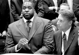 | 9月4日,美国密歇根州底特律市长夸姆·基尔帕特里克(左)在韦恩县巡回法庭出庭。