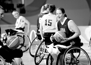 9月5日,美国女子轮椅篮球队在北京科技大学体育馆进行赛前适应性训练。 新华社发