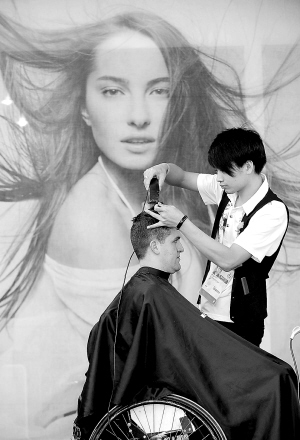 9月5日,参加北京残奥会的一名运动员在北京残奥村美发沙龙理发。 新华社发