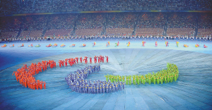 | 由演员组成的国际残奥委会会旗图案。