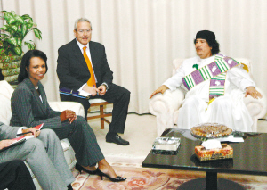 9月5日,在利比亚首都的黎波里,利比亚领导人卡扎菲(右)会见到访的美国国务卿赖斯(左)。这是半个多世纪以来第一位美国国务卿访问利比亚。 新华社/法新