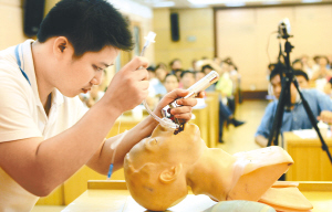 9月6日,由省公共卫生紧急救援指挥中心主办的突发公共事件医疗卫生救援培训班在海口椰海大酒店开班,全省公共卫生紧急救援医疗人才培养活动正式启动。我省将在两年内打造一支300多人的紧急救援精英团队,以提高应对日常急救工作和诸如地震、恐怖袭击等重特大突发事件的应急医疗救援能力和水平。图为学员在进行气管插管技术考试。 本报记者 苏建强 摄