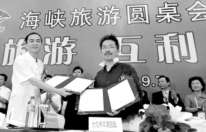 | 9月7日,厦门鼓浪屿菽庄花园代表(左前)和台湾林本源园邸代表(右前)在第四届海峡旅游圆桌会议上签订两岸“两园”旅游对结协议。