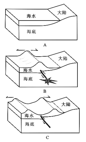 B、深海发生地震时,海底发生激烈的上下方向的位移,某些部位出现猛然的上升或者下沉,产生了其上方的海水巨大的波动,原生的海啸于是就产生了。海啸与一般的海浪不一样,海浪一般在海面附近起伏,涉及的深度不大,而深海地震引起的海啸则是从深海海底到海面的整个水体的波动,其中包含的能量惊人;