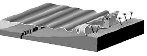 C、地震后几分钟后,原生的海啸分裂成为两个波,一个向深海传播,一个向附近的海岸传播。向海岸传播的海啸,受到岸边的海底地形等影响,在岸边与海底发生相互作用,速度减慢,波长变小,振幅变的很大(可达几十米),在岸边造成很大的破坏。