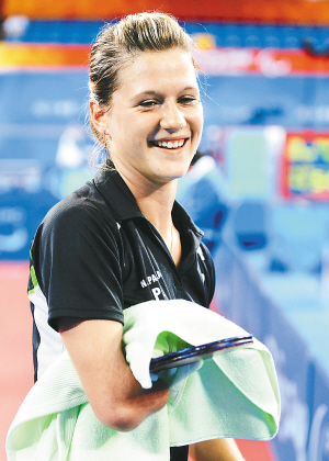 9月7日,波兰乒乓球选手纳塔利娅·帕蒂卡(见上图,新华社发)在北京参加残奥会女子单打F10级A组首场小组赛。当日,被称为乒坛“维纳斯”的独臂少女帕蒂卡继北京奥运会后再次走进北京大学体育馆,开始自己的北京残奥会征程。帕蒂卡是唯一一名既参加北京奥运会、又参加北京残奥会的乒乓球选手。