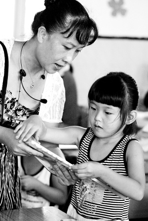 | 刚入学的一年级小学生在老师的指导下,用塑料书皮包装数学课本,摄于海口市第27小学。
