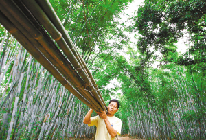 | ↑ 白沙七坊镇保优村黎族农民陈亚左扛着一捆粉丹竹准备出售。该村素有“竹庄”之称,目前全村共种植竹280亩。去年全村人均收入4300元中,有40%以上来自竹子。