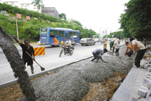 为迎接创办国家卫生城市检查组的检查,最近,三亚市环卫、城建等有关部门加大对城市的整治力度,在旧街道改造、市容美化等方面加快建设。图为三亚榆亚大道拓宽工程施工现场。 本报记者 程范淦 摄