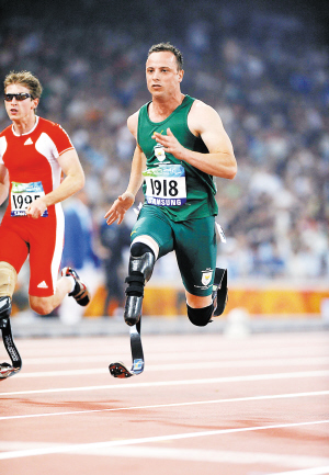 | 9月8日,有“刀锋战士”之称的南非著名残疾人运动员皮斯托瑞斯(右)在残奥会男子100米T44级首轮赛中,以11秒16的成绩顺利晋级。新华社发 |