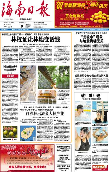 海南日报 头版 001 2008-09-091 2008年09月09日 星期二