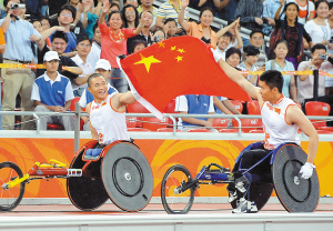 | 获得男子4X100米接力T53/T54级金牌的中国队选手在比赛后庆祝。 |