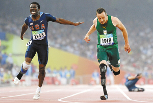 | 在男子100米T44级决赛中,有“刀锋战士”之称的南非著名残疾人运动员皮斯托瑞斯(右)以11秒17的成绩夺得冠军。