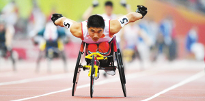 9月9日,在国家体育场进行的北京2008年残奥会男子4X100米T53/T54级决赛中,中国队以49秒90的成绩获得金牌。图为中国队最后一棒选手李虎召在比赛中冲刺。 新华社发