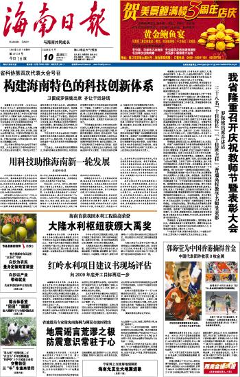 海南日报 头版 001 2008-09-101 2008年09月10日 星期三