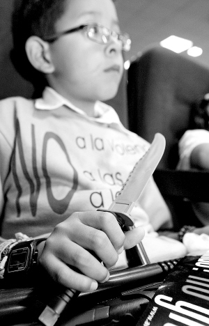 9月9日,在哥斯达黎加阿拉胡埃拉举办的暴力玩具交换会上,一名儿童手握塑料仿真匕首。哥安全部门日前组织了这一活动,旨在引导让孩子们用手中的暴力玩具交换其他非暴力玩具。 新华社/法新