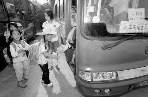 9月10日,孩子们排队上车。 近日,800多名在浙江长兴县小浦中心小学的孩子们坐上了专门的学生班车,每辆班车上都有一名值班老师负责。学生班车为上学的孩子们构筑了一条安全通道。 新华社记者 徐昱 摄