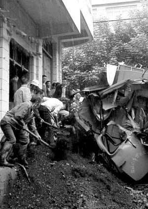 埋压3人1人遇难 9月10日,南充警民奋力营救被埋压的群众。当日,一辆运煤车在四川省南充市嘉陵区一立镇当街发生侧翻,3名行人当场被埋。事发后,当地公安、消防以及干部群众奋力施救,被压的一对母子成功获救,另一名妇女不幸遇难。 新华社发