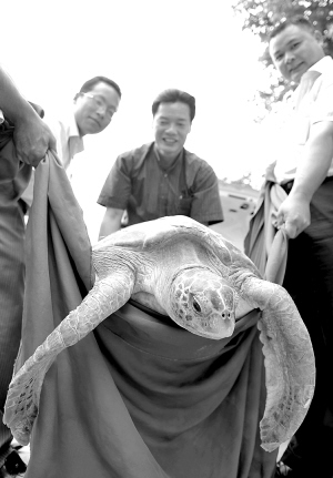 9月10日,在广西南宁市南宁动物园,班明权(中)将这只约300岁的海龟捐赠给动物园。 当日,广西南宁市市民班明权将自己10年前花3万元从海南省买回来的海龟无偿捐赠给南宁动物园,供市民参观。动物园在给海龟体检后,先将其放入单独的池中隔离观察,如无特殊情况,这只重80公斤、约300岁的海龟将与动物园的其他5只海龟一起生活。 新华社记者 周华 摄