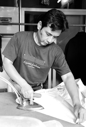 9月10日,因小儿麻痹症致使腿部残疾的苏州市金阊区残疾人“创业标兵”谭坚强在自己开办的干洗店内熨烫衣服。苏州市2008年发布《苏州市区扶持残疾人自主创业意见》,对自主创业的残疾人进行补贴和奖励。 新华社记者 陈琪 摄