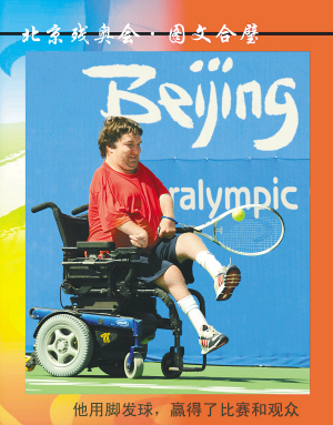 9月10日,在北京残奥会轮椅网球混合级别四分之一决赛中,美国选手尼克·泰勒对阵荷兰选手巴斯·范埃尔普。29岁的尼克·泰勒自幼四肢残疾,手臂萎缩,不能像其他选手那样用手发球,只能将球拍绑在左臂上,发球时则用两脚将球夹起来(右图)。面对曾在雅典残奥会四肢残疾单打铜牌争夺战中击败过他的对手范埃尔普,泰勒在决胜的第三盘中稳定住情绪坚持比赛,不仅赢得抢七局晋级四强,还赢得了全场观众的掌声和尊敬。 新华社发