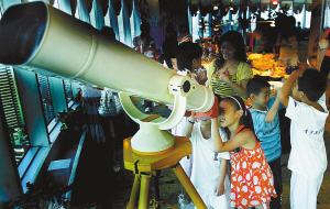 ↑海口市青少年宫天文兴趣小组的孩子们,通过设在黄金大酒店31层的天文望远镜观看月亮。 本报记者 古月 摄