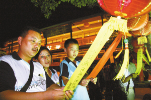 ←中秋节晚上,游客在南山猜灯谜。 本报记者 程范淦 通讯员 陈文武 摄